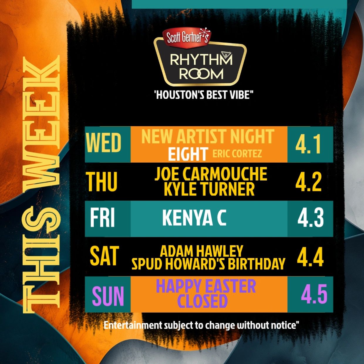 SCOTT GERTNER'S RHYTHM ROOM sets the standard as Houston’s best entertainment venue in the heart of the city. An exclusive hip vibe for new and upcoming entertainers from the local, regional and national scene.