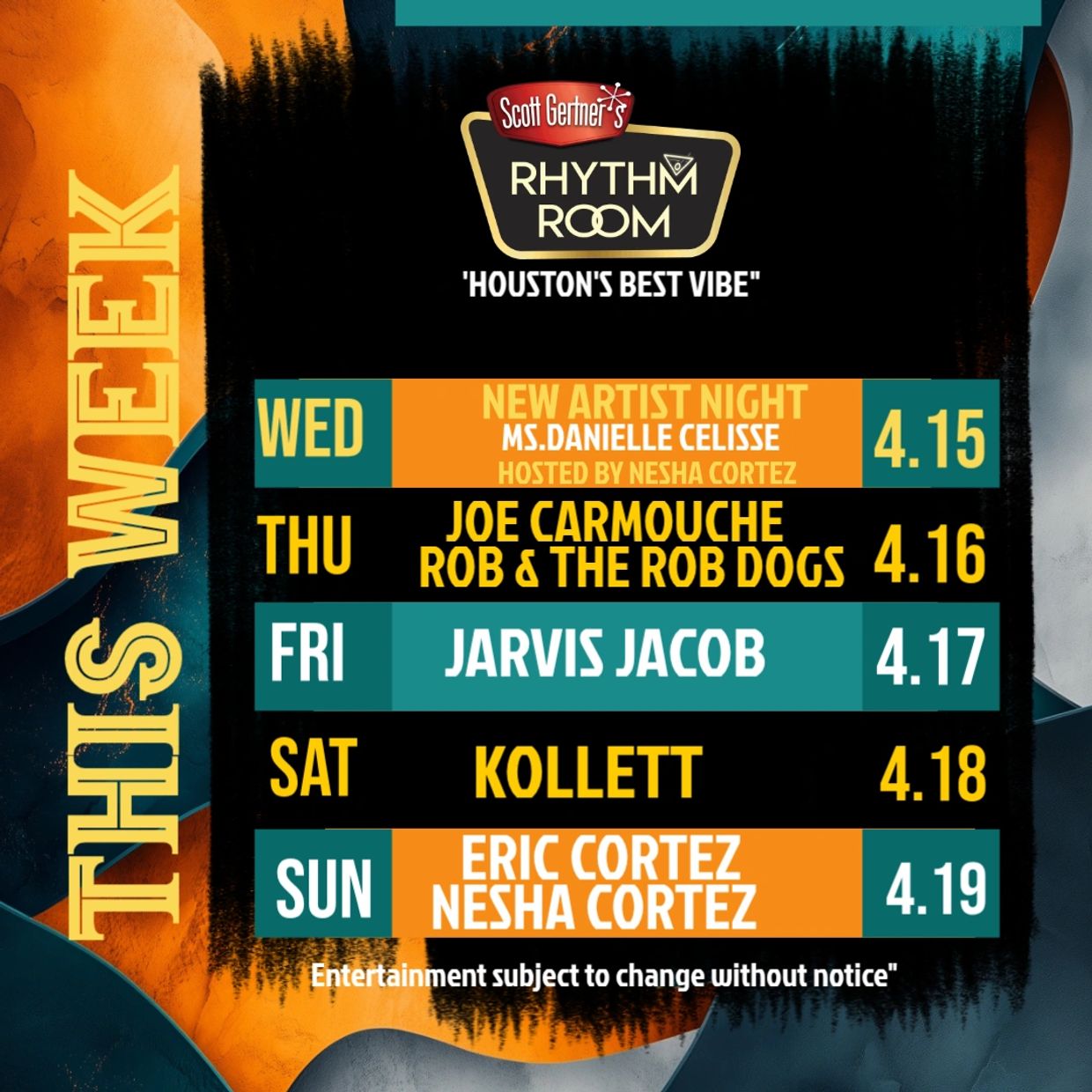 SCOTT GERTNER'S RHYTHM ROOM sets the standard as Houston’s best entertainment venue in the heart of the city. An exclusive hip vibe for new and upcoming entertainers from the local, regional and national scene.